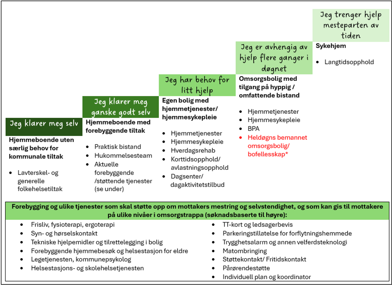 Omsorgstrappa illustrerer at tjenestetilbudet strekker seg fra forebyggende og støttende tiltak til mer omfattende tjenester for de med større hjelpebehov. Ingen tjenester kan i prinsippet utelukkes på noe nivå. Hvor i trappa tjenestene skal plasseres avhenger av bistandsbehov og ressursinnsats. Det er viktig at kommunen har tilstrekkelig mange trinn og tjenester i omsorgstrappa, slik at brukerne får tjenester på rett nivå.
